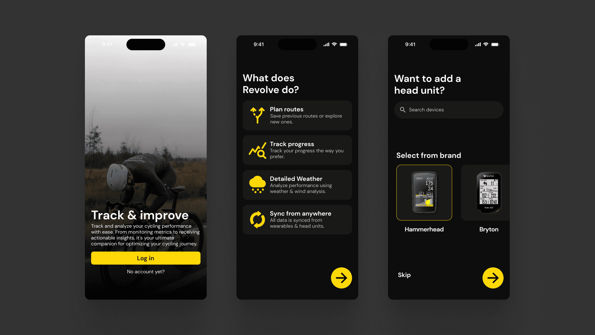 Revolve is a concept for a cycling app that let's you plan routes, analyze data from your rides, check weather conditions, health, connect bike head units, & lets you generate new routes based on your preferences for that particular session or day.