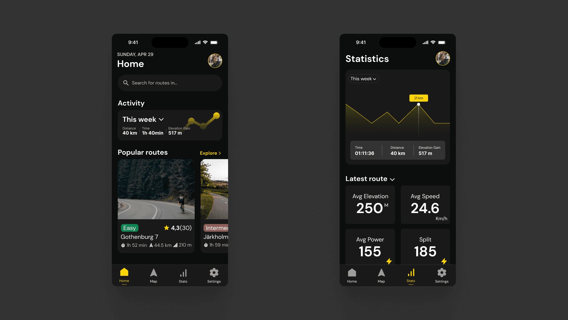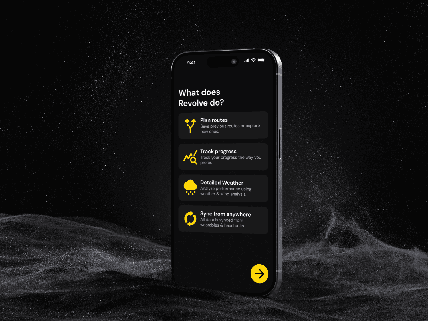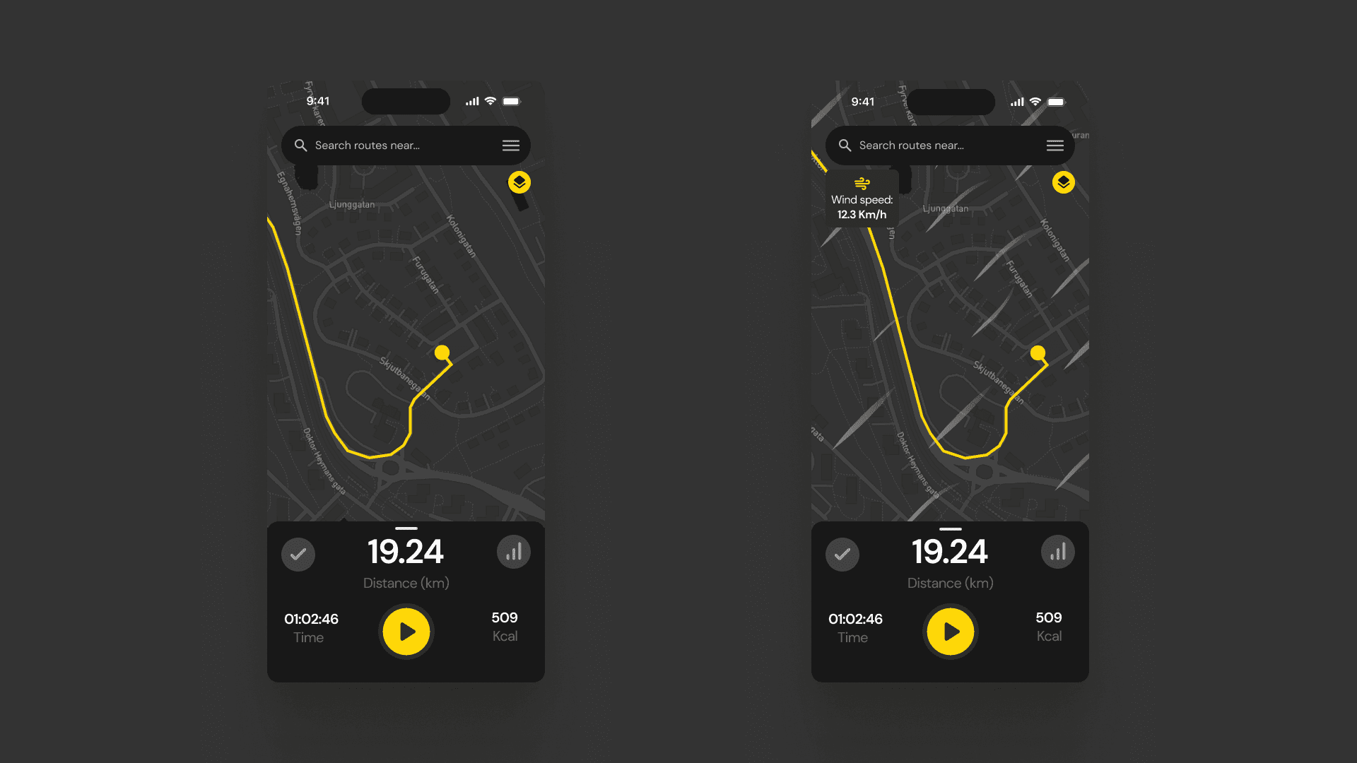 The final result of this idea turned into the concept Revolve, which is an app that converges several points of complex data into a single solution. Revolve lets you plan & share routes, analyze data from the sessions, check weather conditions and how they affect your performance.